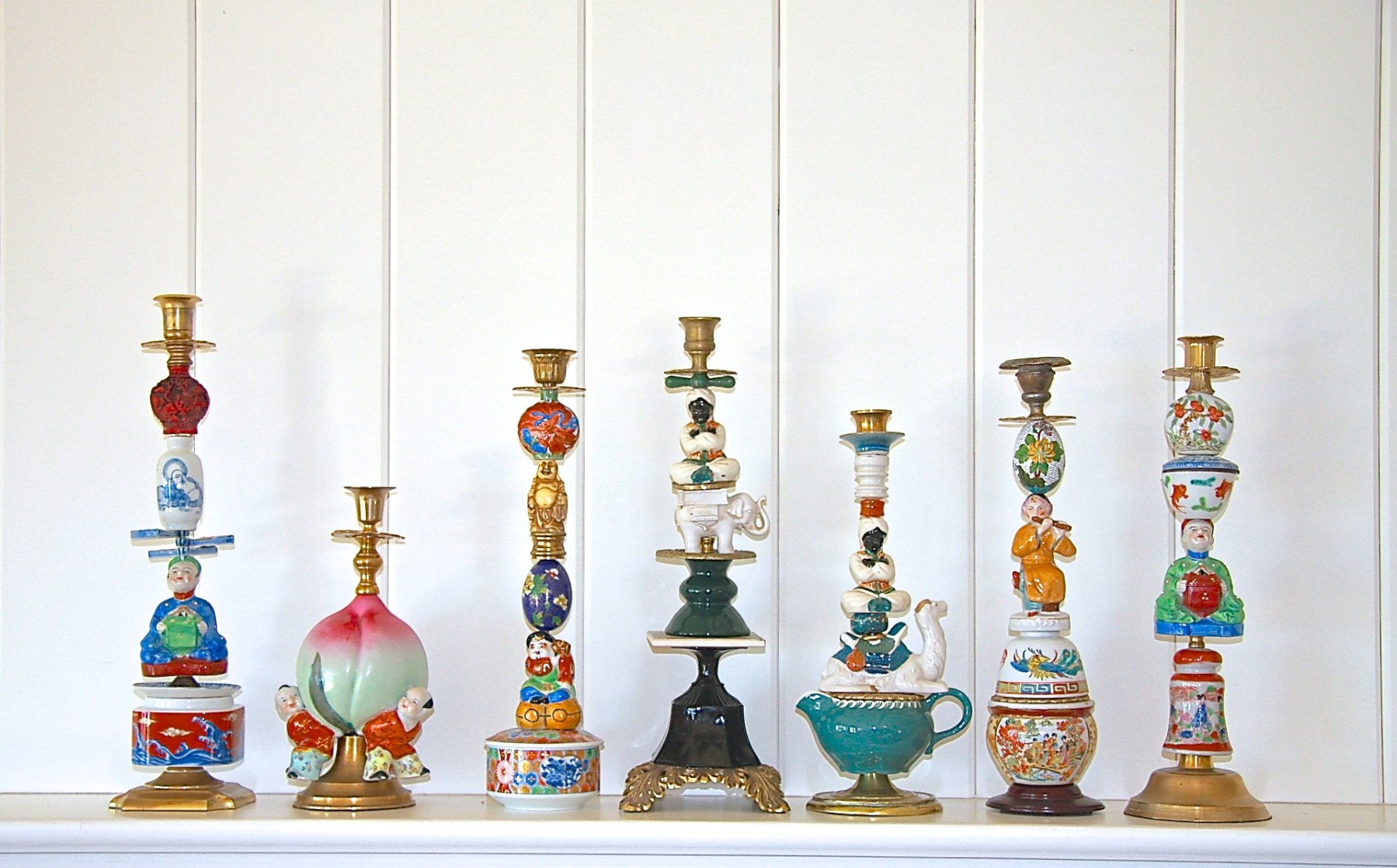 This photo represents just one of my many candlestick collection themes and is created from Asian inspired pieces that include figurines, teapots, sake cups, cloisonné eggs and more. I love the vibrant colors which vary from deep reds and pinks to greens and turquoise and I’ve displayed these Asian candlesticks in almost every room in my house. View my other candlestick themes under the…